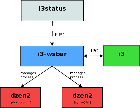 The most common reason to use an external workspace bar is to integrate system information such as what i3status or conky provide into the workspace bar. So, we have i3status or a similar program, which only provides text output (formatted in some way). To display this text nicely on the screen, there are programs such as dzen2, xmobar and similar. We will stick to dzen2 from here on. So, we have the output of i3status, which needs to go into dzen2 somehow. But we also want to display the list of workspaces. i3-wsbar takes input on stdin, combines it with a formatted workspace list and pipes it to dzen2.