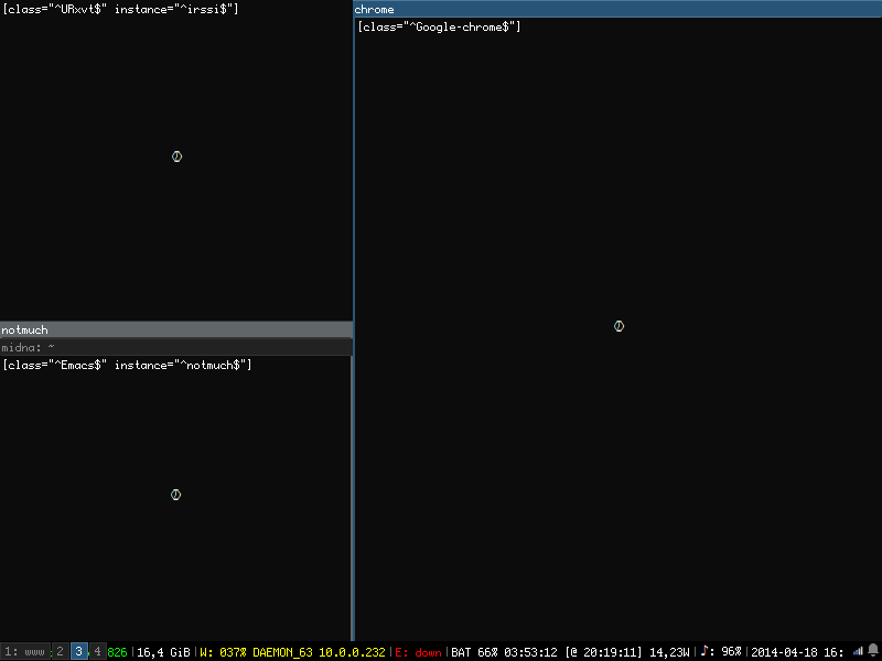 In this layout, the screen is divided into two columns. In the left column, which covers 40% of the screen, there is a terminal emulator running irssi on the top, and a stacked split container with an Emacs window and a terminal emulator on the bottom. In the right column, there is a stacked container with a Chrome window: